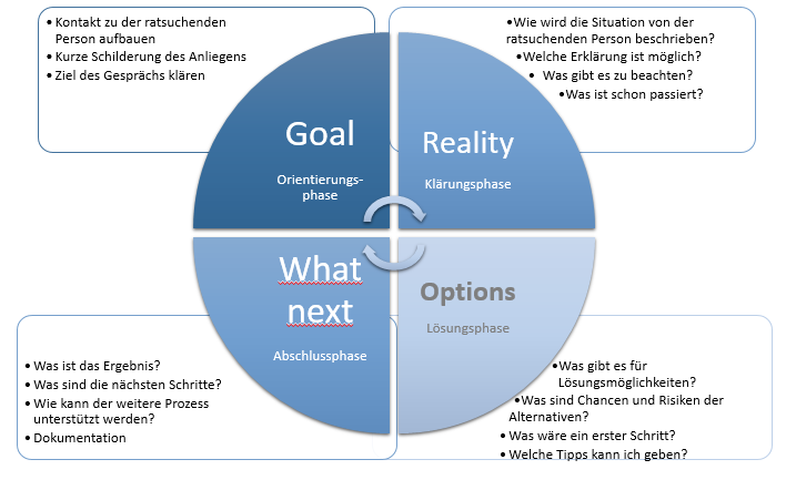 Im ersten Schritt geht es natürlich erstmal darum Kontakt zu der ratsuchenden Person (Mitarbeiter) aufzubauen und sich das Anliegen kurz (!) schildern zu lassen. Gehen Sie dabei noch nicht zu tief in die Details. Wichtig ist auch, dass Sie das Ziel des Gesprächs klären. Möchte der Mitarbeiter Ihre Einschätzung zu der Sache haben, oder möchte er wissen, ob er auf dem richtigen Weg ist?